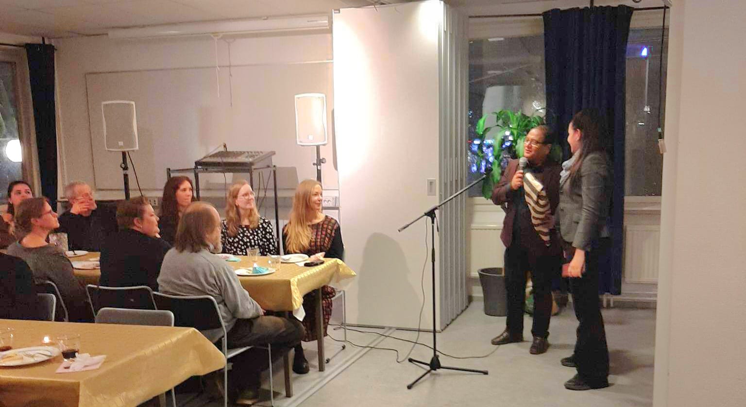 Med oss på festen hade vi Karin Rågsjö och Elena Karlström som pratade politik samtidigt som vi åt och fikade samt lyssnade till Emma Daher som sjöng vackra julsånger och Bengt Hansson som sjöng och spelade gitarr.